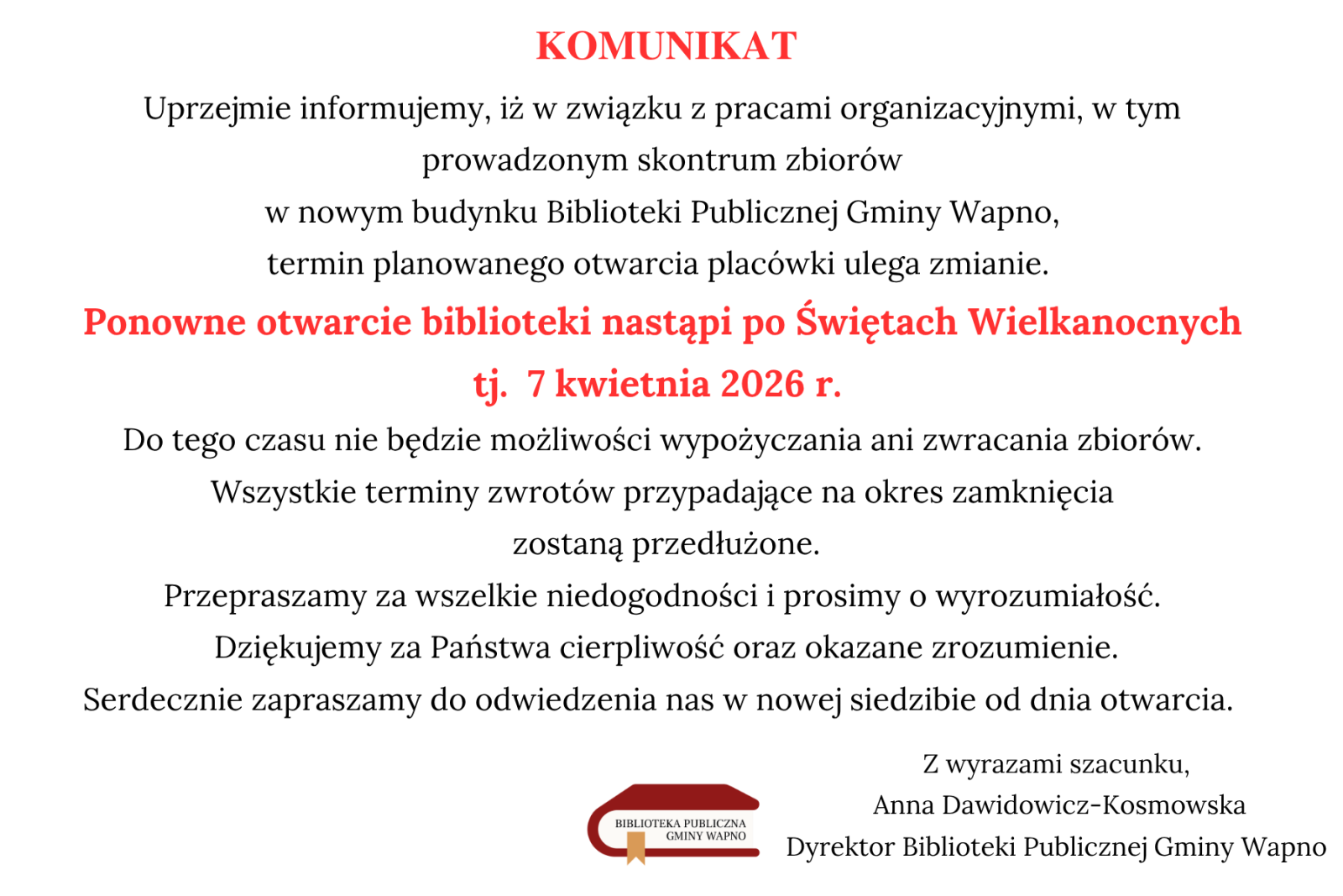 uprzejmie informujemy, że w związku z pracami organizacyjnymi, w tym prowadzonym skontrum zbiorów Biblioteki Publicznej Gminy Wapno, termin planowanego otwarcia placówki ulega zmianie.