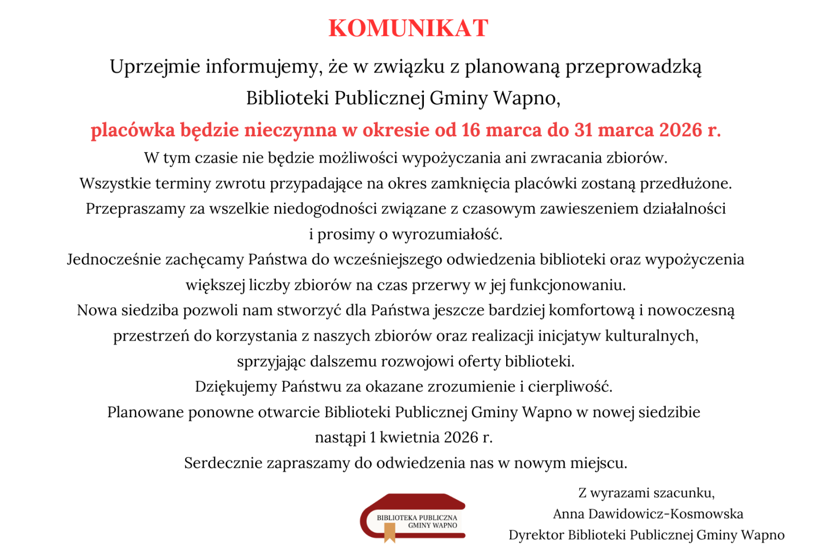 uprzejmie informujemy, że w związku z planowaną przeprowadzką Biblioteki Publicznej Gminy Wapno, placówka będzie nieczynna w okresie od 16 marca do 31 marca 2026 r.